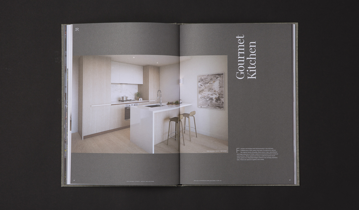 Aesthetically The Reflections brand was designed to compliment the luxurious architecture and its park side setting. Two coinciding brochures were designed to target both owner occupiers and investor markets respectively. The tag line 'Parkside living at its finest' encapsulates an enviable lifestyle unique to this property and its surrounds.